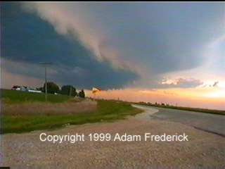 We thought that we were probably done storm chasing for 1999, but when we noticed that a strong cold front was moving into the area, we thought we had one last chance. Around 4:00, there was a batch of storms to our north, but we weren't quite sure if they would be tornadic. We waited around until 5:00 when we noticed that storms were developing in SW Iowa in front of the cold front. These storms appeared to have a greater potential to become tornadic than the storms to the north. So we decided to go south on I-35 then west on I-80 toward Omaha. As we were approaching the storm, we could see the large anvil and also some mammatus clouds. The storm appeared to be dropping heavy rain on the Interstate, so we felt that we needed to get south of the storm. We got off the Interstate at exit 86 and headed south toward Greenfield Iowa on Highway 25.